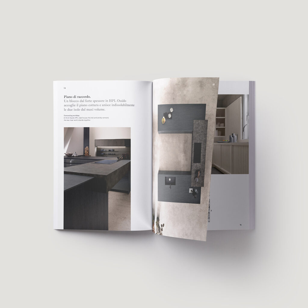 Tosca is designed using the Look System and allows the alternation of dark and light elements, combinations of colour and wood, changes in volume and the careful use of solid and open spaces. The technical elements are perfectly integrated in this kitchen of infinite design options.