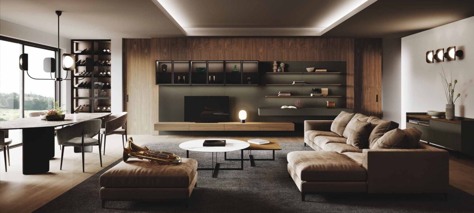 Living wall in matt lacquered finish, Evans air display cabinets with aluminum and glass frame, central wooden TV compartment.